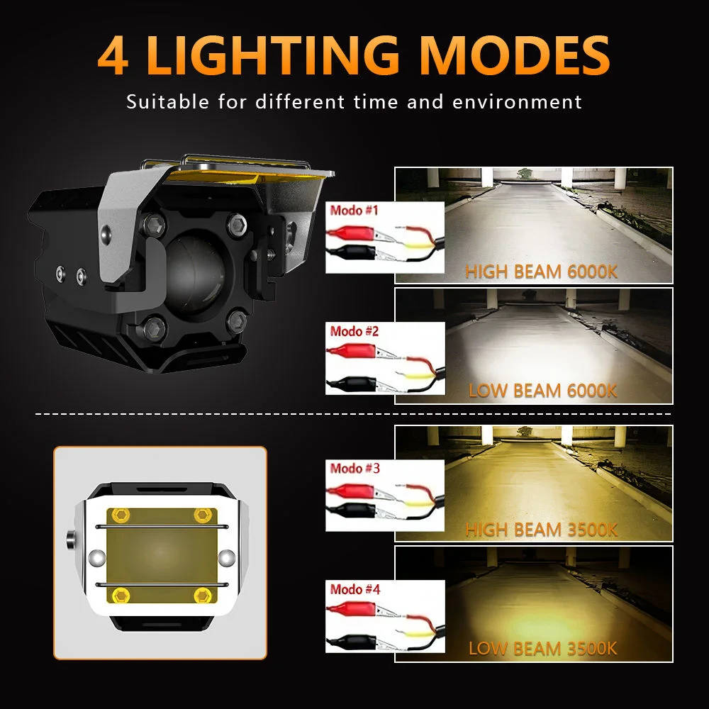 Designed for versatility, the lighting system offers multiple beam modes, allowing you to switch between bright white and warm yellow tones as well as high and low beam options to suit different environments and weather conditions. The adjustable mounting bracket makes installation easy on motorcycles, scooters, ATVs, or other compatible vehicles, giving you flexibility in positioning for optimal coverage. The sturdy clamp design keeps the lights firmly in place, reducing vibration and maintaining consistent alignment even on rough terrain.
