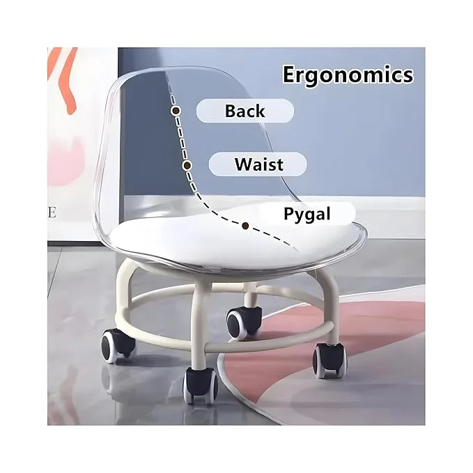 Bring style and comfort into your space with this Modern Transparent Mini Rolling Chair, designed with a blend of elegance and functionality. Its clear, curved backrest adds a modern aesthetic, while the cushioned cream seat provides comfortable support. The sturdy base features smooth-gliding wheels, making it easy to move around effortlessly.